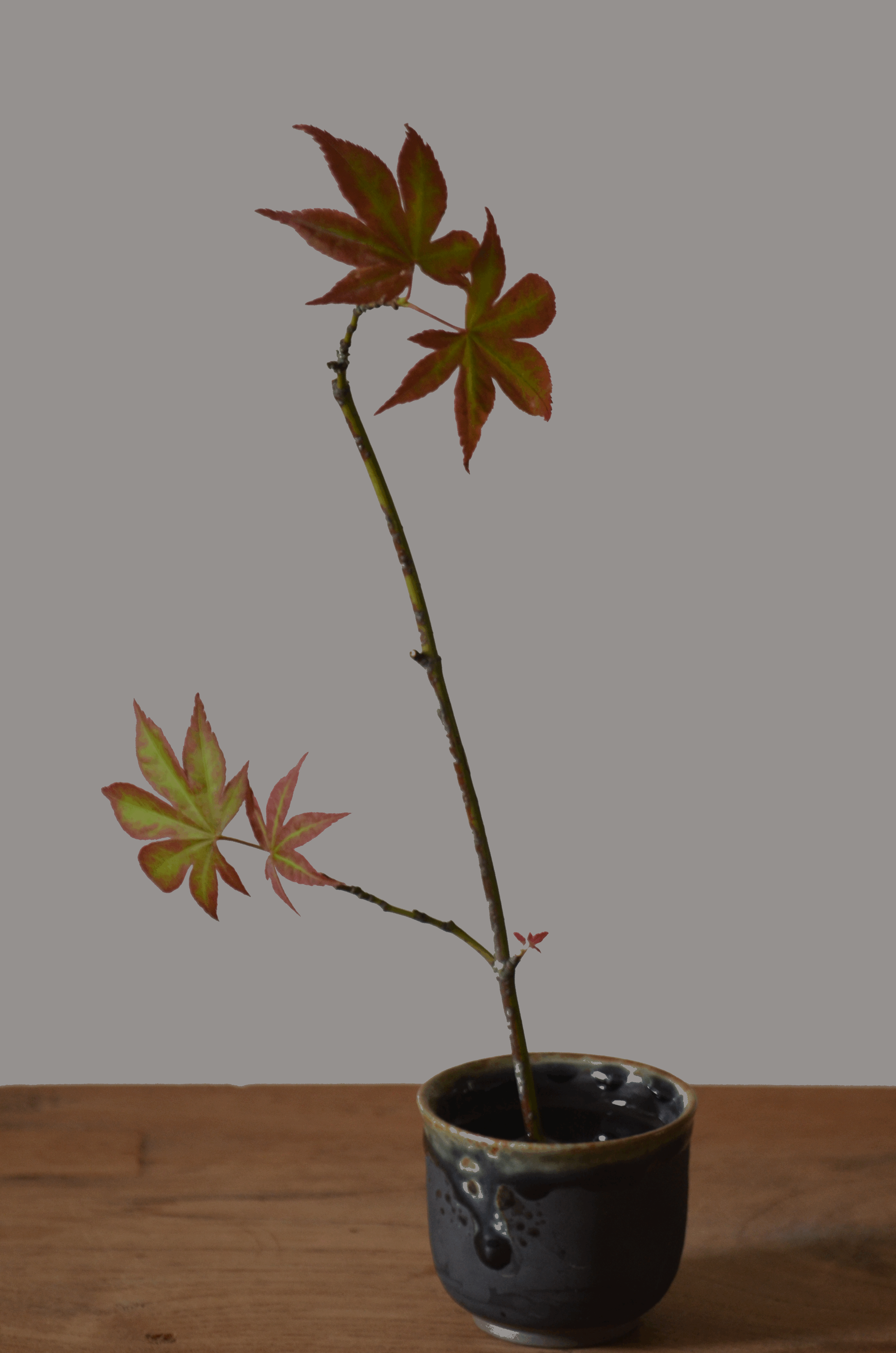 Uit de tuin heb ik een takje esdoorn meegenomen….. toen zag ik “mini mini mini” blaadjes. Een blad is kleiner dan 1 mm! 庭のもみじを切り、ハッと気がついた。。。1ミリに満たない極小の葉が健気についてる!