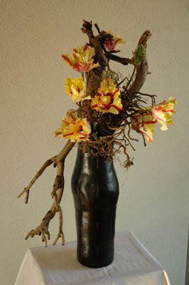 いけばなをいけるときには、花や植物の美しさを見極めることからはじまります。 つまり、材料を既に手にしています。これと対照に、やきものを作るときには無形の粘土から美しい形を作らねばなりません。この造 形過程の違いはとても興味深いものです。